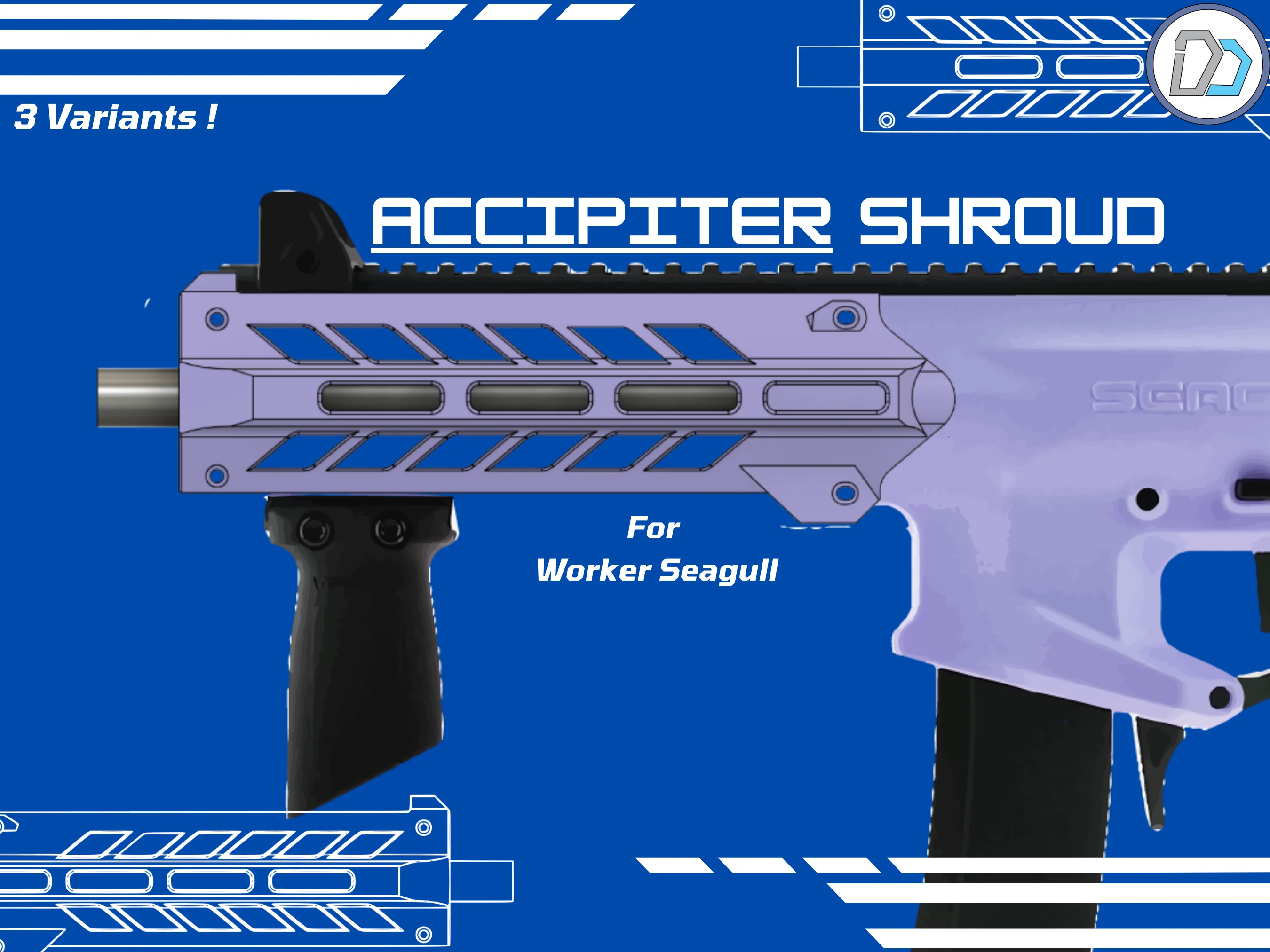 Transform your Worker Seagull blaster with the D2 Maker Accipiter Handguard — a versatile and aggressive front-end upgrade inspired by modern tactical design. This 3D-printable STL fileset offers three configurations to suit your customization needs.